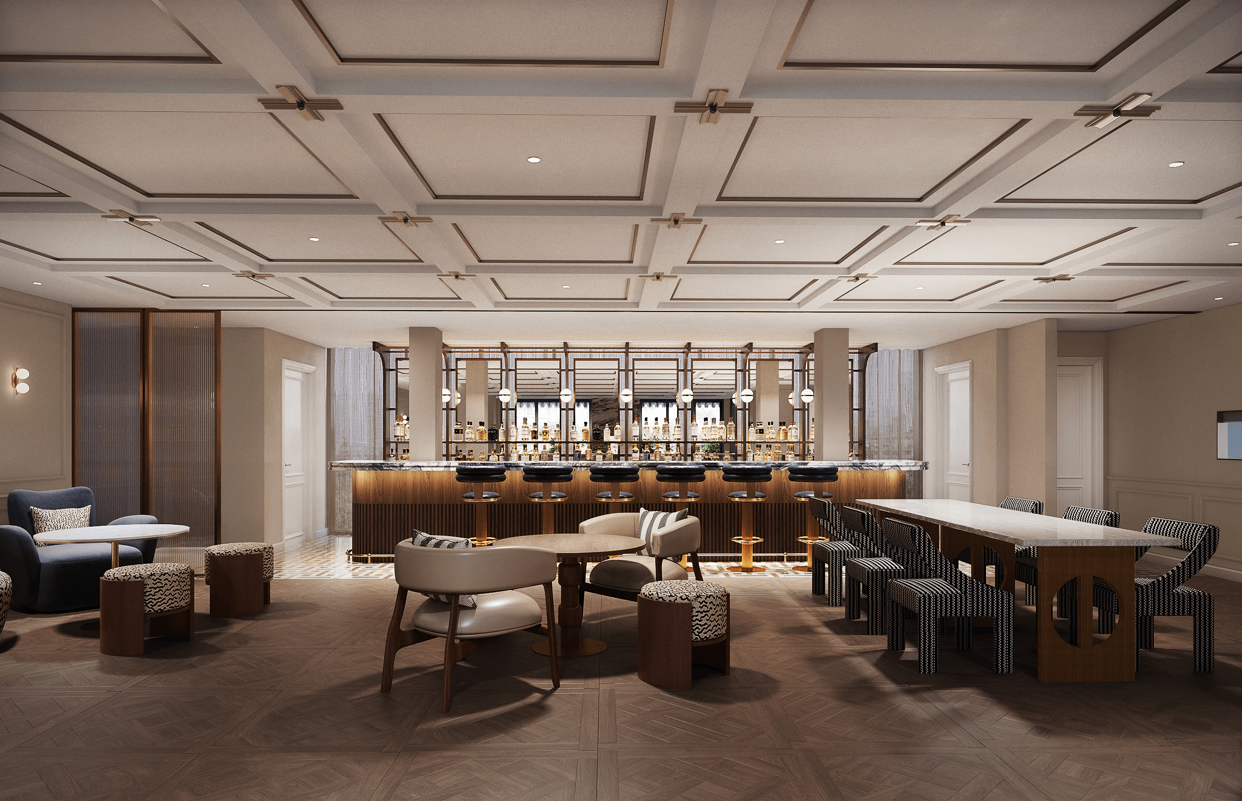 The South Terrace & Lounge will reveal renewed interiors with updated finishes, mirrors to draw in more daylight, flexible room dividers to adapt to different gatherings, a refined lounge bar and a dual-aspect fireplace, alongside a refreshed rooftop terrace that further highlights its skyline setting and city views. The Mezzanine Lounge will remain one of our most intimate settings, with deep, inviting tones, warm brass accents, bespoke lounge seating and a new, dedicated bar creating the perfect backdrop for smaller celebrations and private events.